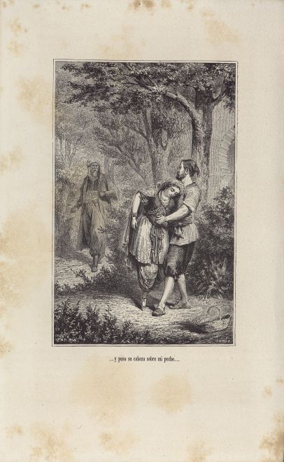 Notice some accurate details, such as the captive's basket with some herbs. Good drawing and engraving; Zoraida's figure is specially remarkable; notice her face, dress, gesture...; also Agi Morato's figure is worth noting, but the captive's is less natural. |