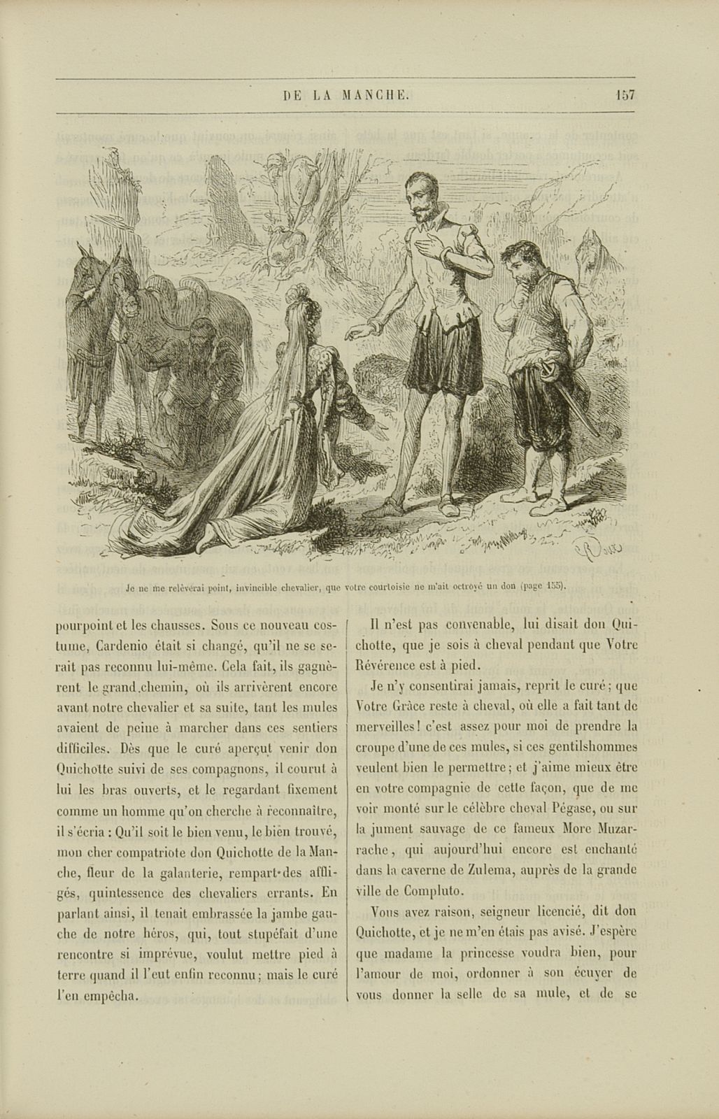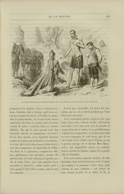 | Commentary | Princess Micomicona (Dorotea) knelt before don Quixote begging for his help; also in the scene, Sancho and the barber (disguised with a fake beard).