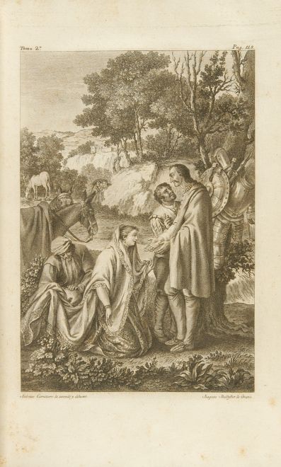 The barber appears disguised with a beard as her squire. Don Quixote's arms still hanging from a tree (don Quixote's penance). In the background, hidden, the priest and Cardenio. Drawing and engraving are quite good; Ballester is an excellent engraver (clear burin lines); figures with good volume. |