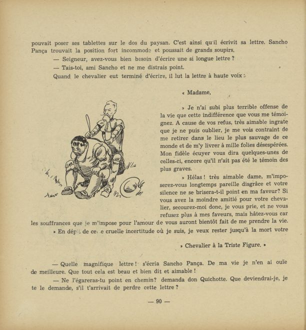 | Commentary | Don Quixote writing his love letter for Dulcinea on Sancho's back.