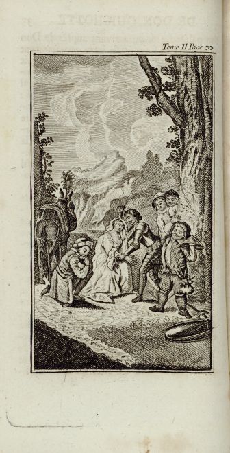 Micomicona (Dorotea) kneels before don Quixote and the knight tries to prevent her from doing it. The barber, also knelt and disguised with a beard (ox tail), laughs, while Sancho holds the barber basin. Behind the trees, the priest and Cardenio are hidden. Poor engraving, but acceptable. |