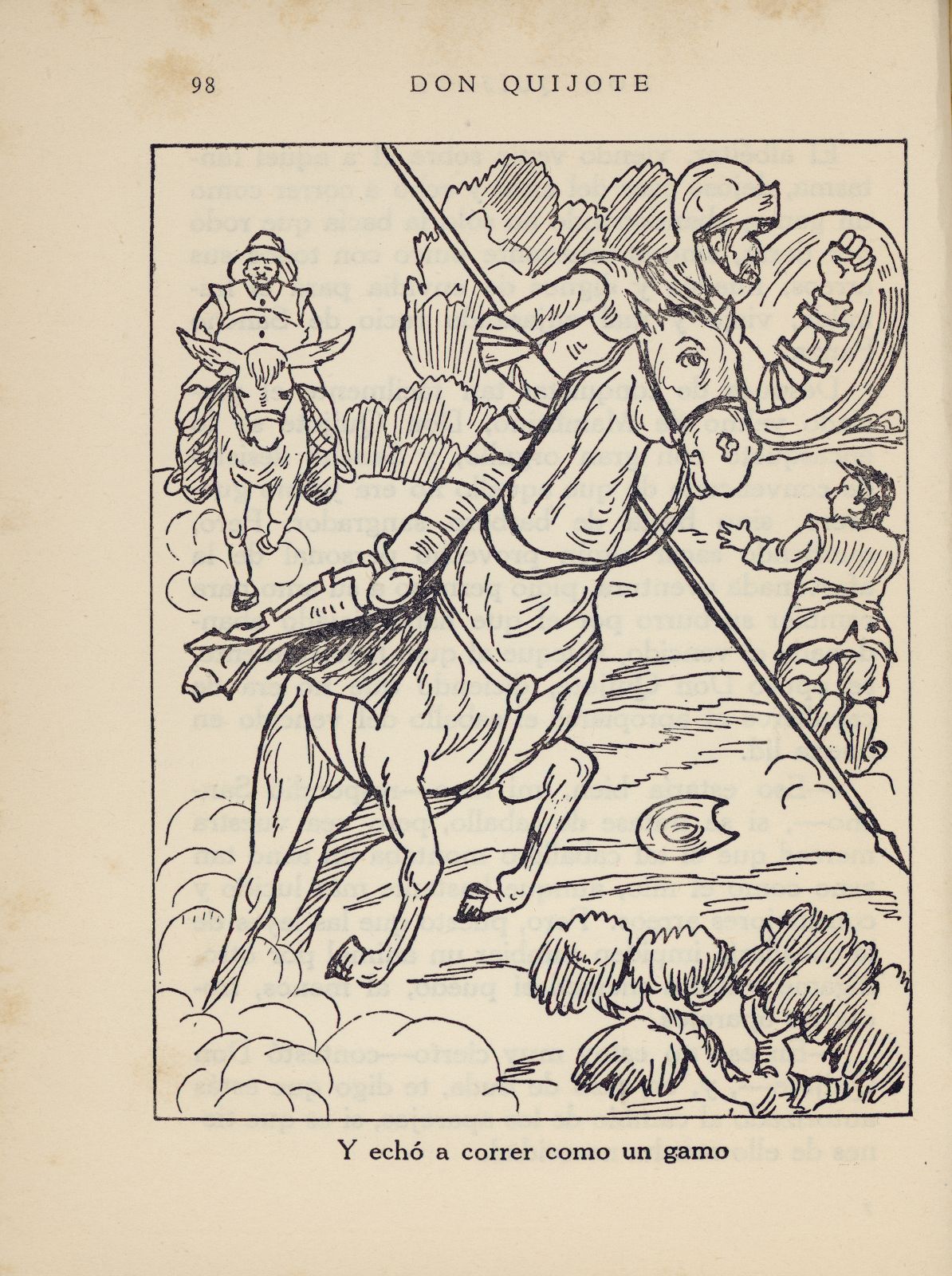 | Commentary | Don Quixote, mounted on Rocinante, charges against the barber, who runs away leaving his basin (Mambrino's helmet) behind; aside, Sancho on his donkey.