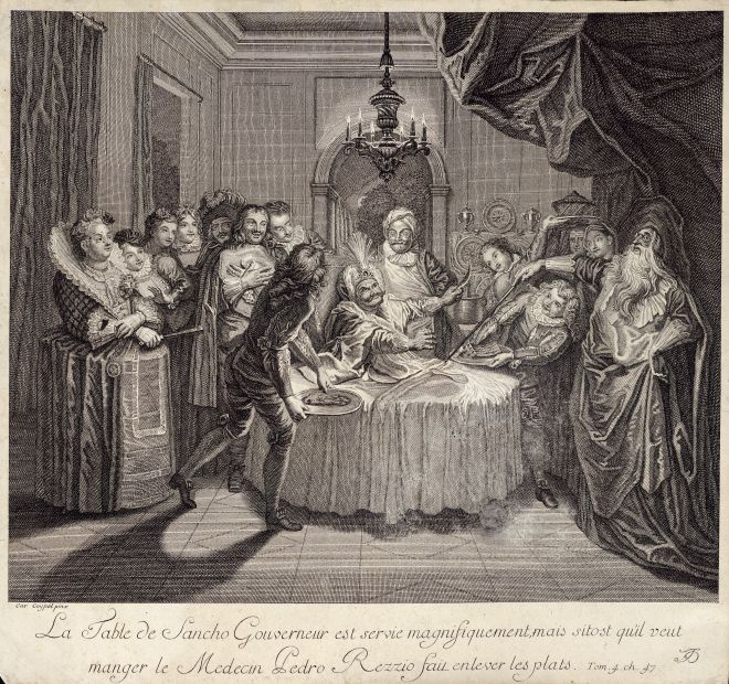 Pedro Recio is dressed in a ridiculous manner. Suitable scene for Coypel's style: many servants (forming a semicircle), rich architecture, chandelier, curtains, clothes... Remarkable light and shadow effects. Excellent drawing and engraving. |